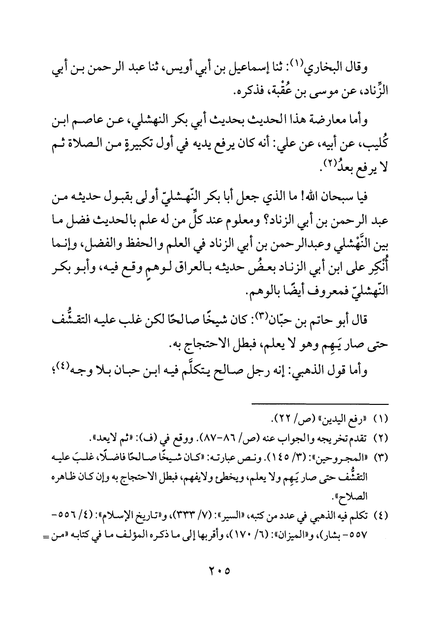 فيا سبحان الله! ما الذي جعل أبا بكر النّهشليّ أولى بقبول حديثه من عبد الرحمن بن أبي الزناد؟ ومعلوم عند كلِّ من له علم بالحديث فضل ما بين النَّهْشلي وعبدالرحمن بن أبي الزناد في العلم والحفظ والفضل، وإنما أُنْكِر على ابن أبي الزناد بعضُ حديثه بالعراق لوهمٍ وقع فيه، وأبو بكر النّهشليّ فمعروف أيضًا بالوهم.