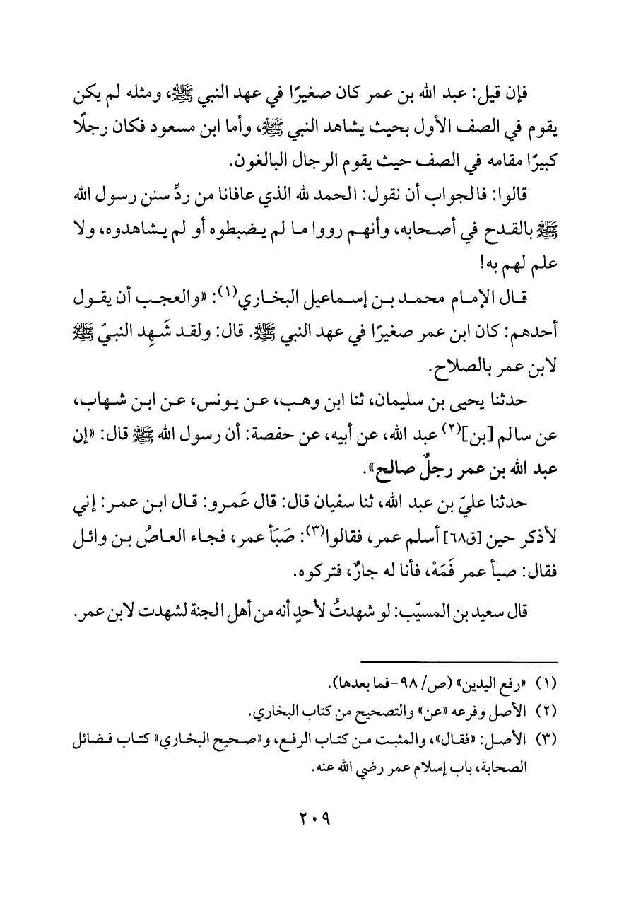 قال الإمام محمد بن إسماعيل البخاري (¬١): «والعجب أن يقول أحدهم: كان ابن عمر صغيرًا في عهد النبي - صلى الله عليه وسلم -. قال: ولقد شَهِد النبيّ - صلى الله عليه وسلم - لابن عمر بالصلاح.