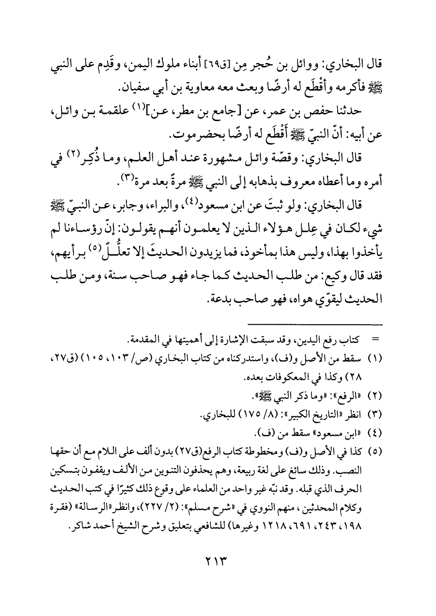 (¬٥) كذا في الأصل و (ف) ومخطوطة كتاب الرفع (ق ٢٧) بدون ألف على اللام مع أن حقها النصب. وذلك سائغ على لغة ربيعة، وهم يحذفون التنوين من الألف ويقفون بتسكين الحرف الذي قبله. وقد نبّه غير واحد من العلماء على وقوع ذلك كثيرًا في كتب الحديث وكلام المحدثين، منهم النووي في «شرح مسلم»: (٢/ ٢٢٧)، وانظر «الرسالة» (فقرة ١٩٨، ٢٤٣، ٦٩١، ١٢١٨ وغيرها) للشافعي بتعليق وشرح الشيخ أحمد شاكر.