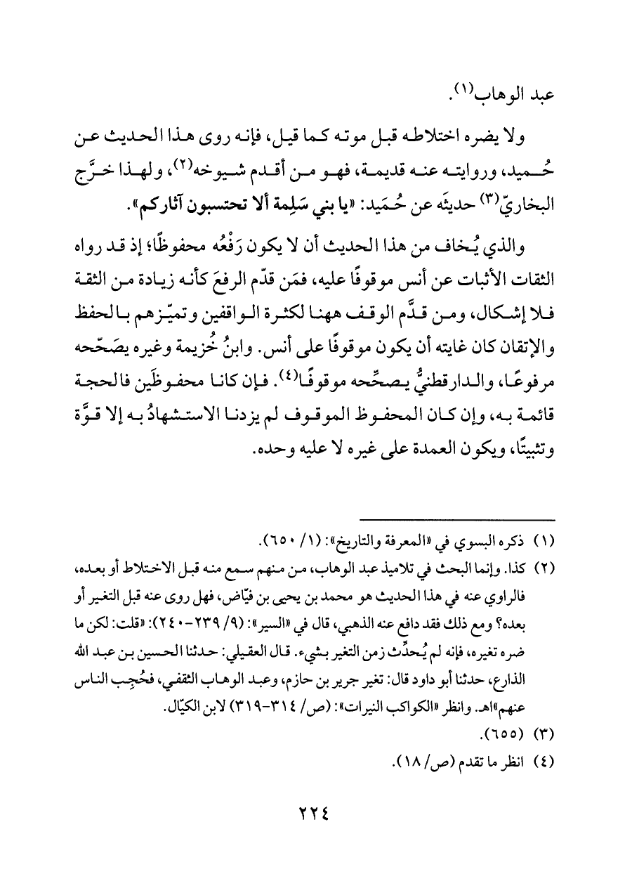 ولا يضره اختلاطه قبل موته كما قيل، فإنه روى هذا الحديث عن حُميد، وروايته عنه قديمة، فهو من أقدم شيوخه (¬٢)، ولهذا خرَّج البخاريّ (¬٣) حديثَه عن حُمَيد: «يا بني سَلِمة ألا تحتسبون آثاركم».