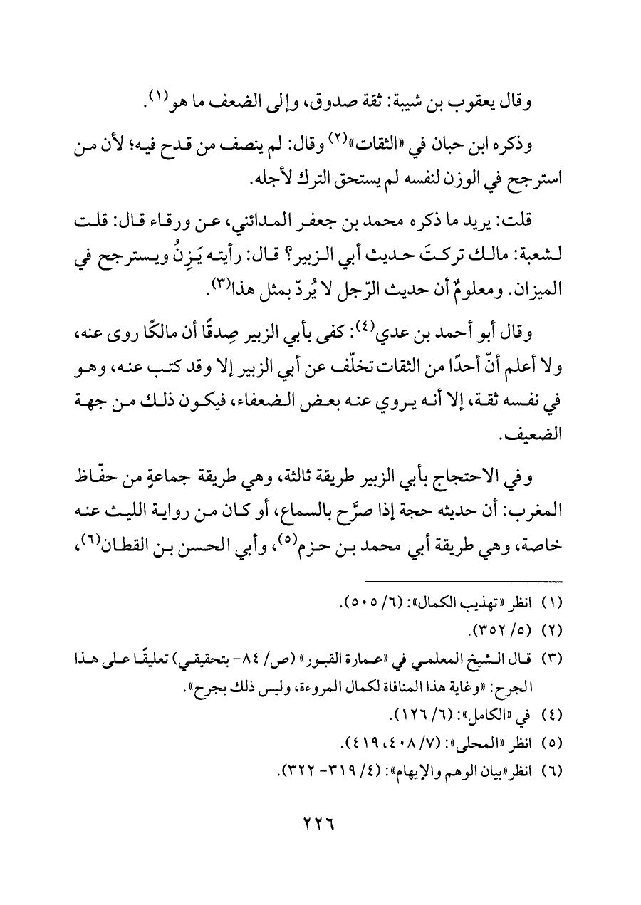 قلت: يريد ما ذكره محمد بن جعفر المدائني، عن ورقاء قال: قلت لشعبة: مالك تركتَ حديث أبي الزبير؟ قال: رأيته يَزِنُ ويسترجح في الميزان. ومعلومٌ أن حديث الرّجل لا يُردّ بمثل هذا (¬٣).