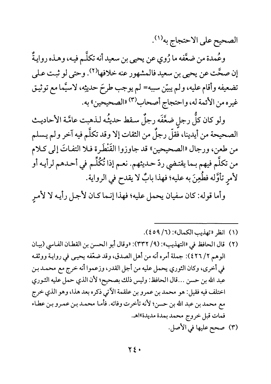 ولو كان كلُّ رجلٍ ضعَّفَه رجلٌ سقط حديثُه لذهبت عامَّة الأحاديث الصحيحة من أيدينا، فقلّ رجلٌ من الثقات إلا وقد تكلَّم فيه آخر ولم يسلم من طعن، ورجال «الصحيحين» قد جاوزوا القَنْطَرة فلا التفاتَ إلى كلام من تكلَّم فيهم بما يقتضي ردّ حديثهم. نعم إذا تُكُلِّم في أحدهم لرأيه أو لأمرٍ تأوَّله فطُعِنَ به عليه؛ فهذا بابٌ لا يقدح في الرواية.