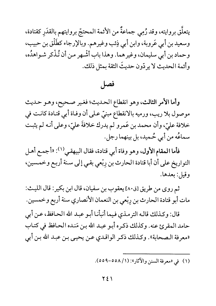 وأما الأمر الثالث، وهو انقطاع الحديث؛ فغير صحيح، وهو حديث موصول بلا ريب، ورميه بالانقطاع مبنيّ على أن وفاة أبي قتادة كانت في خلافة عليّ، وأن محمد بن عَمرو لم يدرك خلافةَ عليّ، وعلى أنه لم يثبت سماعُه من أبي حُميد، بل بينهما رجل.