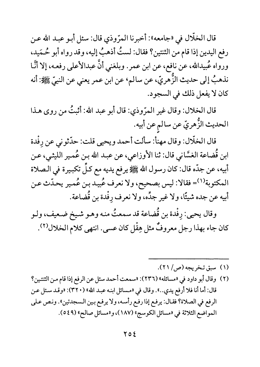 قال الخلّال في «جامعه»: أخبرنا المرّوذي قال: سئل أبو عبد الله عن رفع اليدين إذا قام من الثنتين؟ فقال: لستُ أذهبُ إليه، وقد رواه أبو حُمَيد، ورواه عُبيدالله، عن نافع، عن ابن عمر. وبلغني أنَّ عبدالأعلى رفعه، إلا أنَّا نذهبُ إلى حديث الزُّهريّ، عن سالم، عن ابن عمر يعني عن النبيّ - صلى الله عليه وسلم -: أنه كان لا يفعل ذلك في السجود.