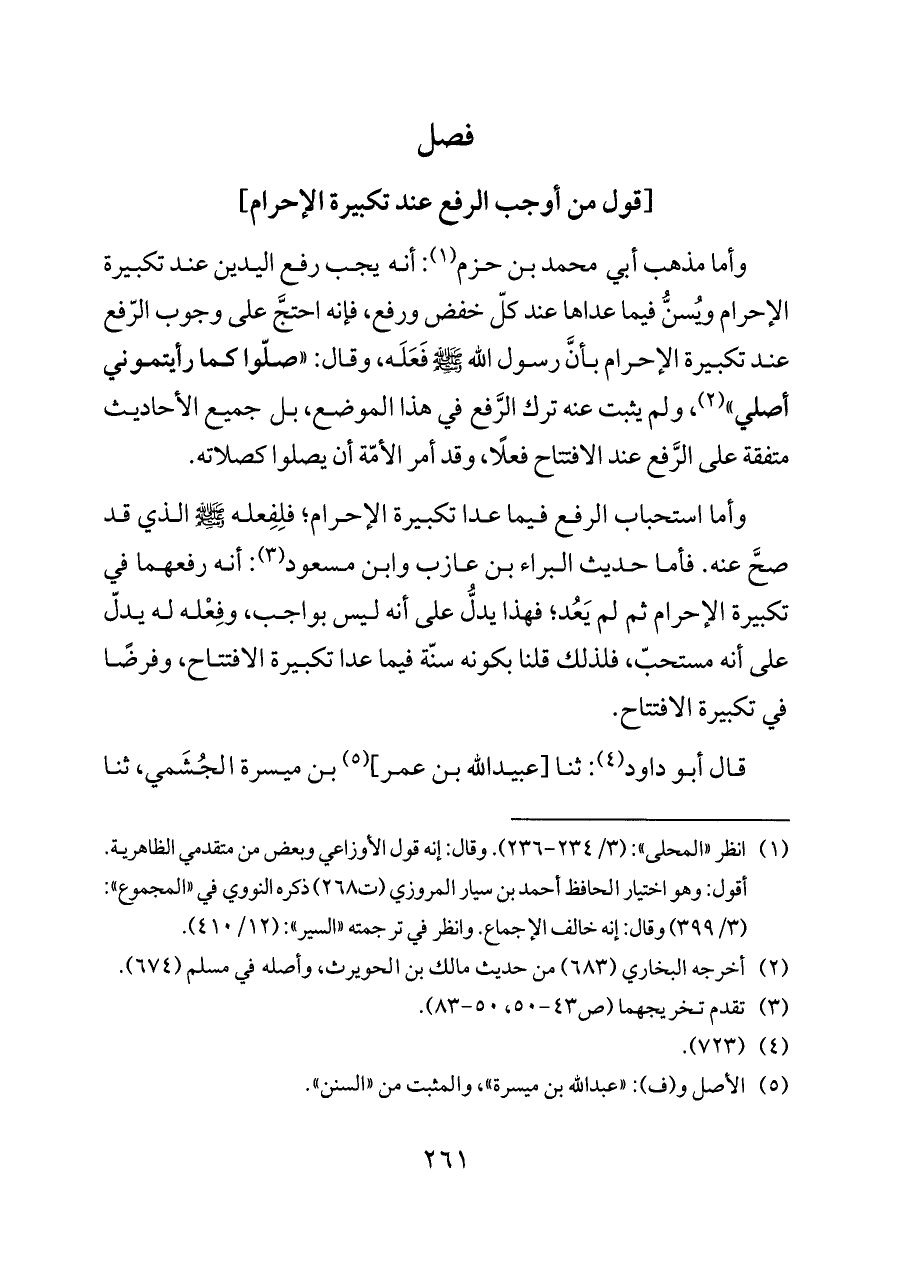 وأما مذهب أبي محمد بن حزم (¬١): أنه يجب رفع اليدين عند تكبيرة الإحرام ويُسنُّ فيما عداها عند كلّ خفض ورفع، فإنه احتجَّ على وجوب الرّفع عند تكبيرة الإحرام بأنَّ رسول الله - صلى الله عليه وسلم - فَعَلَه، وقال: «صلّوا كما رأيتموني أصلي» (¬٢)، ولم يثبت عنه ترك الرَّفع في هذا الموضع، بل جميع الأحاديث متفقة على الرَّفع عند الافتتاح فعلًا، وقد أمر الأمّة أن يصلوا كصلاته.