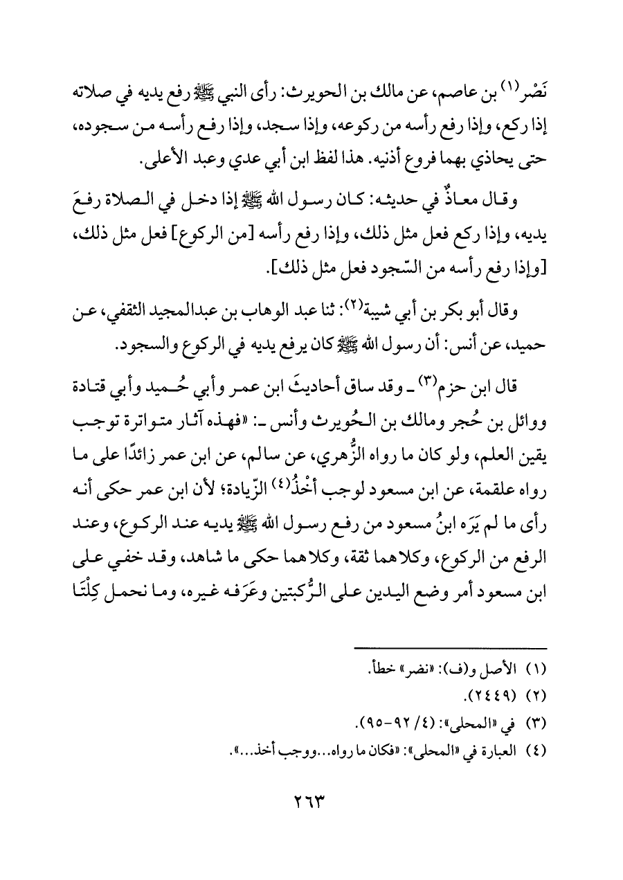 قال ابن حزم (¬٣) ــ وقد ساق أحاديثَ ابن عمر وأبي حُميد وأبي قتادة ووائل بن حُجر ومالك بن الحُويرث وأنس ــ: «فهذه آثار متواترة توجب يقين العلم، ولو كان ما رواه الزُّهري، عن سالم، عن ابن عمر زائدًا على ما رواه علقمة، عن ابن مسعود لوجب أخْذُ (¬٤) الزّيادة؛ لأن ابن عمر حكى أنه رأى ما لم يَرَه ابنُ مسعود من رفع رسول الله - صلى الله عليه وسلم - يديه عند الركوع، وعند الرفع من الركوع، وكلاهما ثقة، وكلاهما حكى ما شاهد، وقد خفي على ابن مسعود أمر وضع اليدين على الرُّكبتين وعَرَفه غيره، وما نحمل كِلْتَا