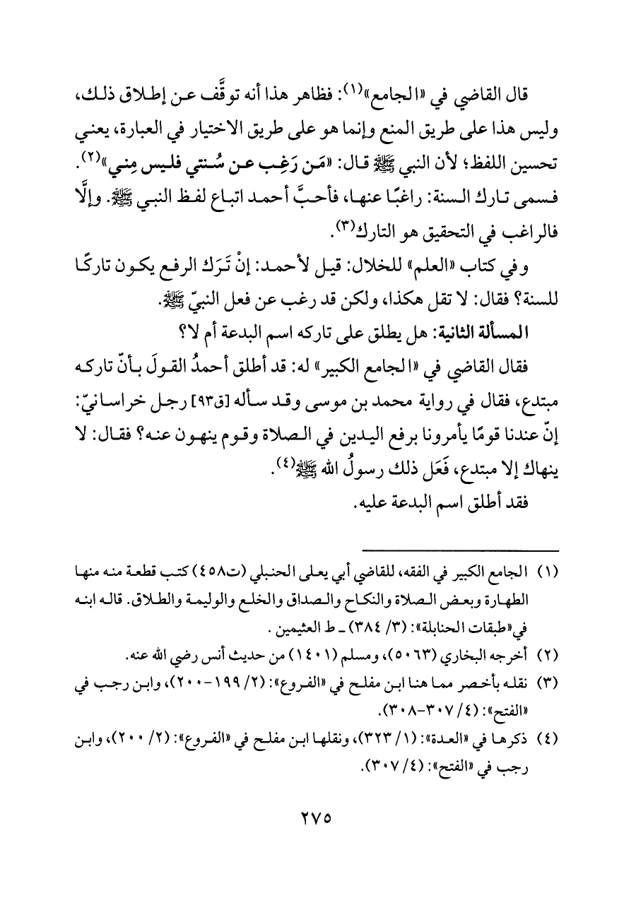 وفي كتاب «العلم» للخلال: قيل لأحمد: إنْ تَرَك الرفع يكون تاركًا للسنة؟ فقال: لا تقل هكذا، ولكن قد رغب عن فعل النبيّ - صلى الله عليه وسلم -.