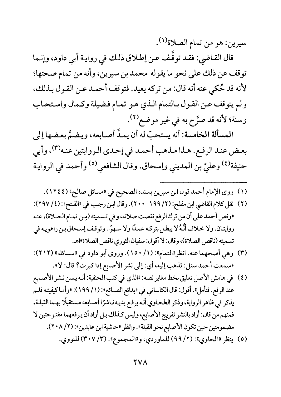 (¬٢) نقل كلام القاضي ابن مفلح: (٢/ ١٩٩ - ٢٠٠). وقال ابن رجب في «الفتح»: (٤/ ٢٩٧): «ونص أحمد على أن من ترك الرفع نقصت صلاته، وفي تسميته (مِن تمام الصلاة)، عنه روايتان. ولا خلاف أنَّهُ لا يبطل بتركه عمدًا ولا سهوًا. وتوقف إسحاق بن راهويه في تسميته (ناقص الصلاة)، وقال: لا أقول: سفيان الثوري ناقص الصلاة» اهـ.