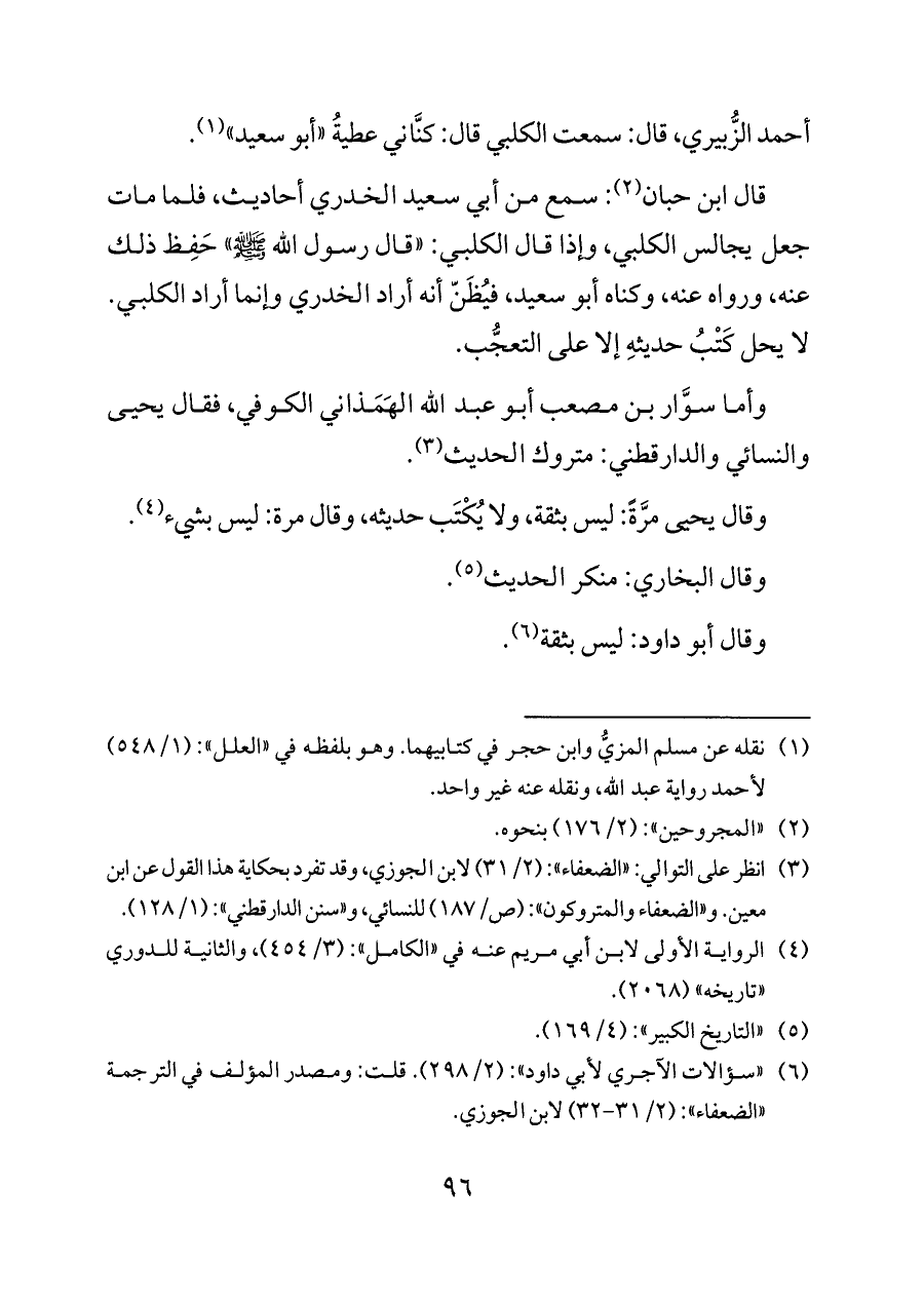 قال ابن حبان (¬٢): سمع من أبي سعيد الخدري أحاديث، فلما مات جعل يجالس الكلبي، وإذا قال الكلبي: «قال رسول الله - صلى الله عليه وسلم -» حَفِظ ذلك عنه، ورواه عنه، وكناه أبو سعيد، فيُظَنّ أنه أراد الخدري وإنما أراد الكلبي. لا يحل كَتْبُ حديثهِ إلا على التعجُّب.