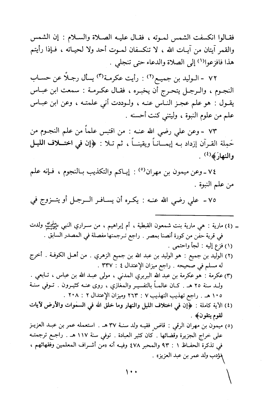 73- وعن علي رضي الله عنه: من اقتبس علما من علم النجوم من حملة القرآن إزداد به إيمانا ويقينا، ثم تلا: إِنَّ فِي اخْتِلافِ اللَّيْلِ وَالنَّهارِ