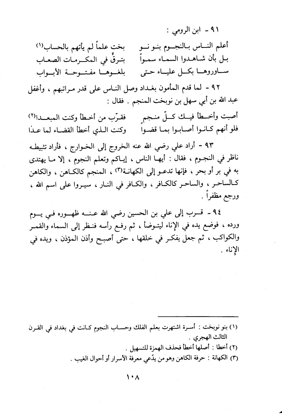 92- لما قدم المأمون بغداد وصل الناس على قدر مراتبهم، وأغفل عبد الله بن أبي سهل بن نوبخت المنجم. فقال: