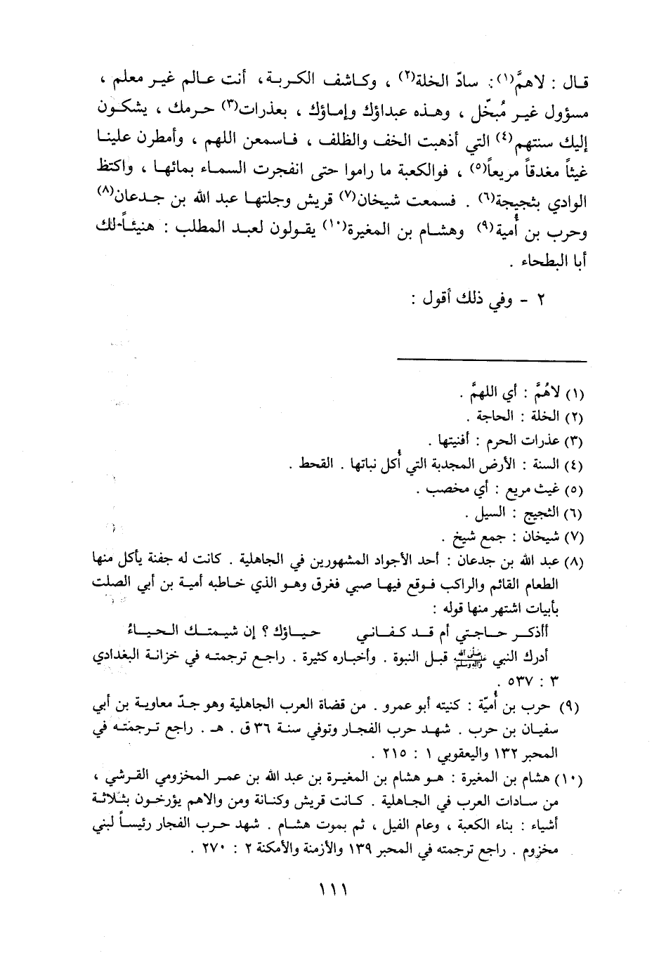 قال: لاهمّ «1» : سادّ الخلة «2» ، وكاشف الكربة، أنت عالم غير معلم، مسؤول غير مبخّل، وهذه عبداؤك وإماؤك، بعذرات «3» حرمك، يشكون إليك سنتهم «4» التي أذهبت الخف والظلف، فاسمعن اللهم، وأمطرن علينا غيثا مغدقا مريعا «5» ، فوالكعبة ما راموا حتى انفجرت السماء بمائها، واكتظ الوادي بثجيجة «6» . فسمعت شيخان «7» قريش وجلتها عبد الله بن جدعان»