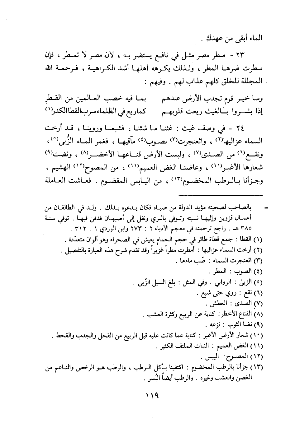 23- مطر مصر مثل في نافع يستضر به، لأن مصر لا تمطر، فإن مطرت ضرها المطر، ولذلك يكرهه أهلها أشد الكراهية، فرحمة الله المجللة للخلق كلهم عذاب لهم. وفيهم: