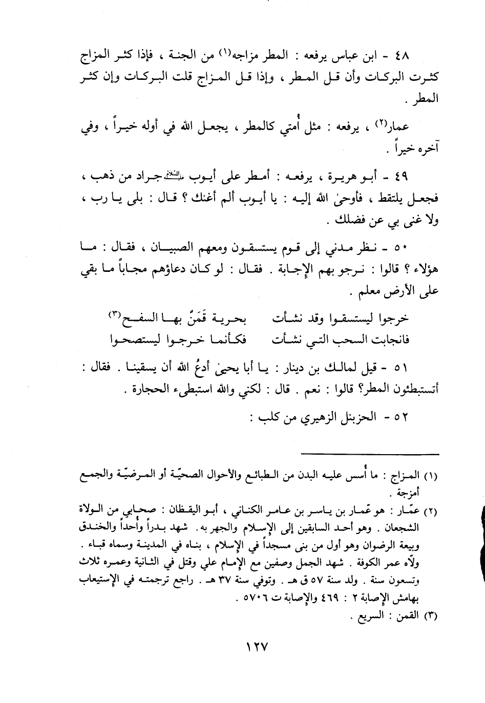48- ابن عباس يرفعه: المطر مزاجه «1» من الجنة، فإذا كثر المزاج كثرت البركات وأن قل المطر، وإذا قل المزاج قلت البركات وإن كثر المطر.