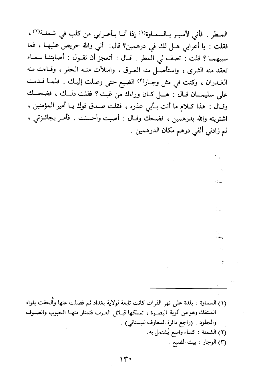الضبع حتى وصلت إليك. فلما قدمت على سليمان قال: هل كان وراءك من غيث؟ فقلت ذلك، فضحك وقال: هذا كلام ما أنت بأبي عذره، فقلت صدق فوك يا أمير المؤمنين، اشتريته والله بدرهمين، فضحك وقال: أصبت وأحسنت. فأمر بجائزتي، ثم زادني ألفي درهم مكان الدرهمين.
