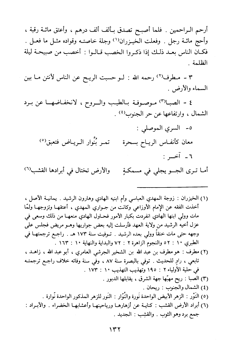 4- الصبا «3» موصوفة بالطيب والروح، لانخفاضها عن برد الشمال، وارتفاعها عن حر الجنوب «4» .