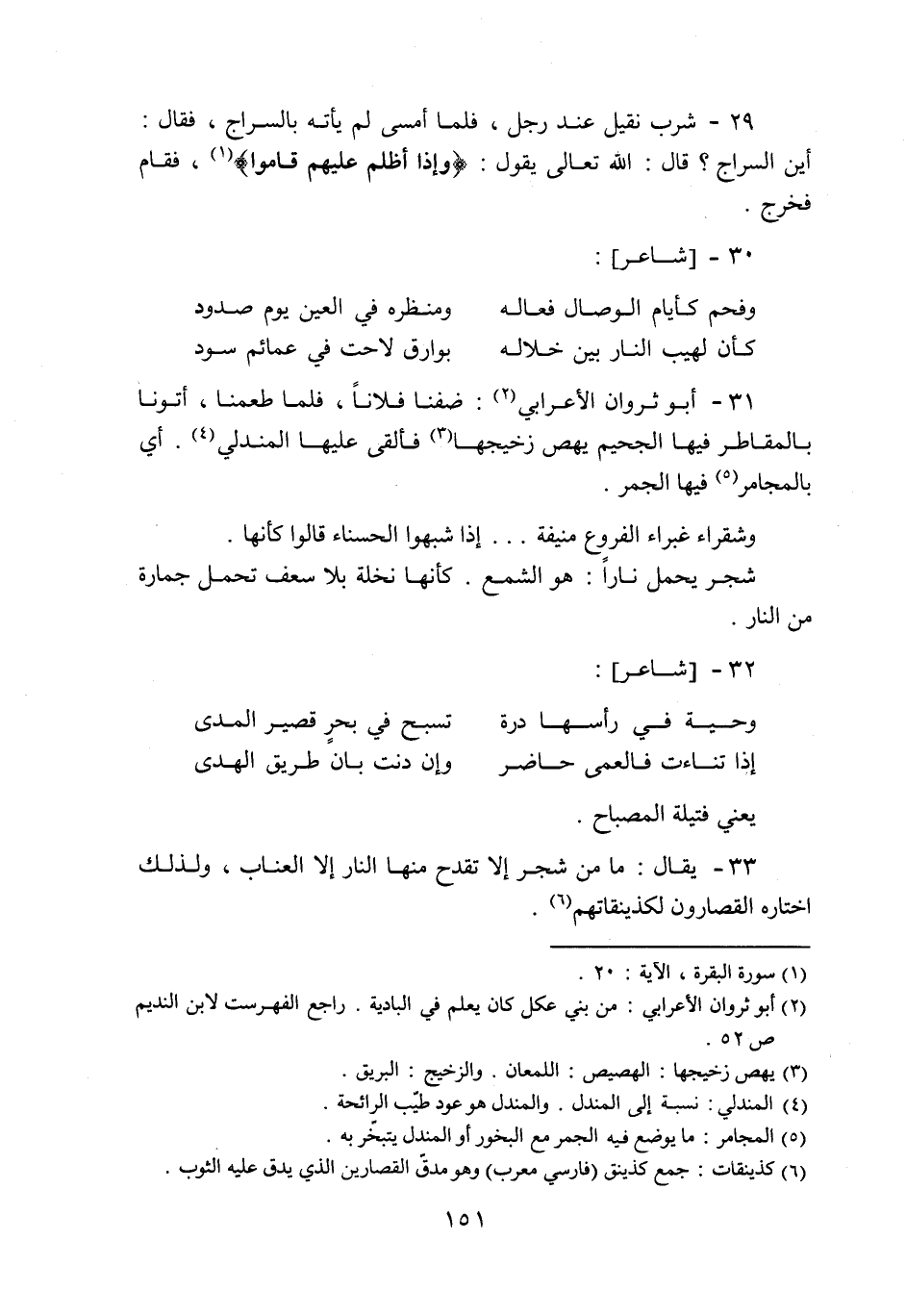 31- أبو ثروان الأعرابي «2» : ضفنا فلانا، فلما طعمنا، أتونا بالمقاطر فيها الجحيم يهص زخيجها «3» فألقى عليها المندلي «4» . أي بالمجامر «5» فيها الجمر.