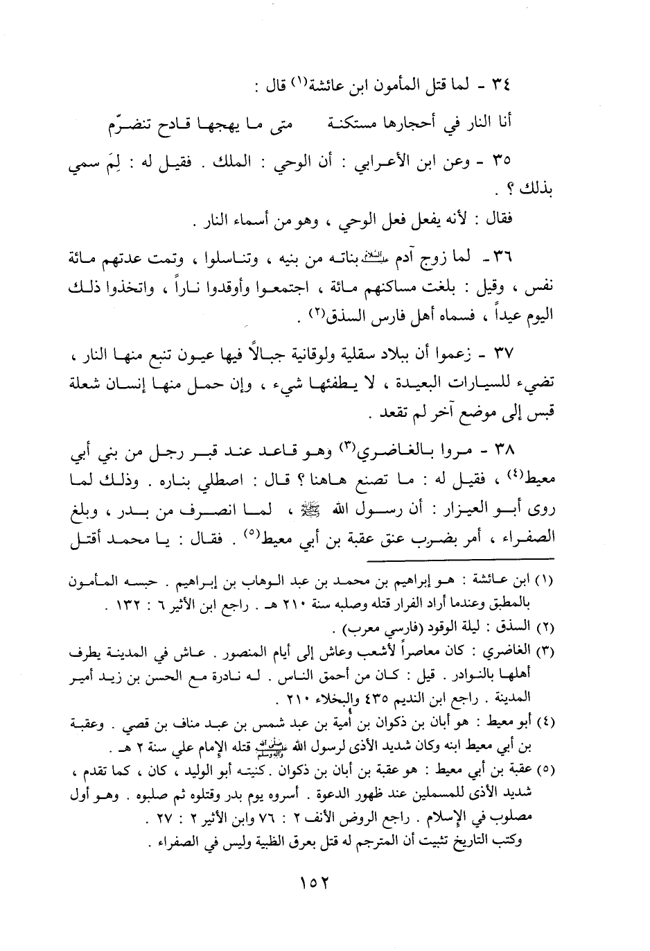 38- مروا بالغاضري «3» وهو قاعد عند قبر رجل من بني أبي معيط «4» ، فقيل له: ما تصنع هاهنا؟ قال: اصطلي بناره. وذلك لما روى أبو العيزار: أن رسول الله صلّى الله عليه وسلّم، لما انصرف من بدر، وبلغ الصفراء، أمر بضرب عنق عقبة بن أبي معيط «5» . فقال: يا محمد أقتل