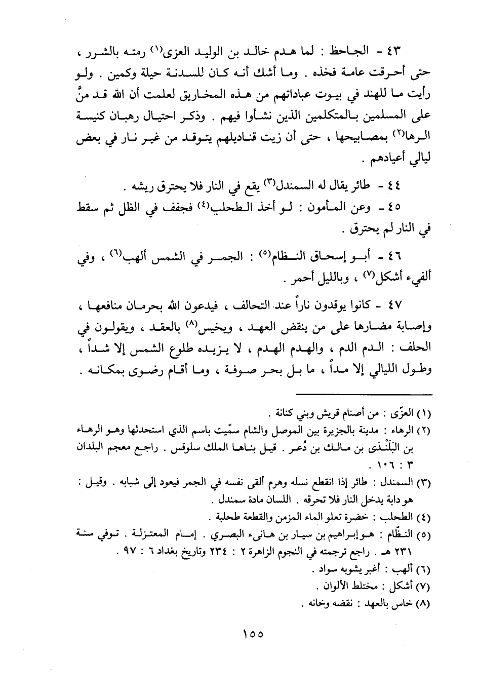 43- الجاحظ: لما هدم خالد بن الوليد العزى «1» رمته بالشرر، حتى أحرقت عامة فخذه. وما أشك أنه كان للسدنة حيلة وكمين. ولو رأيت ما للهند في بيوت عباداتهم من هذه المخاريق لعلمت أن الله قد منّ على المسلمين بالمتكلمين الذين نشأوا فيهم. وذكر احتيال رهبان كنيسة الرها «2» بمصابيحها، حتى أن زيت قناديلهم يتوقد من غير نار في بعض ليالي أعيادهم.
