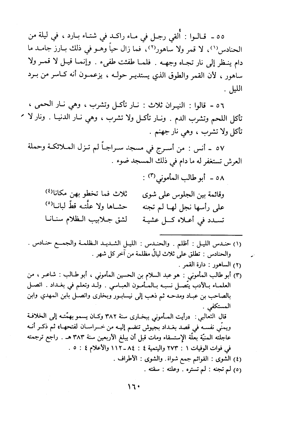 55- قالوا: ألقي رجل في ماء راكد في شتاء بارد، في ليلة من الحنادس «1» ، لا قمر ولا ساهور «2» ، فما زال حيا وهو في ذلك بارز جامد ما دام ينظر إلى نار تجاه وجهه. فلما طفئت طفىء. وإنما قيل لا قمر ولا ساهور، لأن القمر والطوق الذي يستدير حوله، يزعمون أنه كاسر من برد الليل.