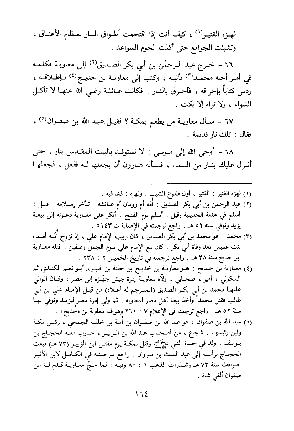 67- سأل معاوية من يطعم بمكة؟ فقيل عبد الله بن صفوان «5» ، فقال: تلك نار قديمة.