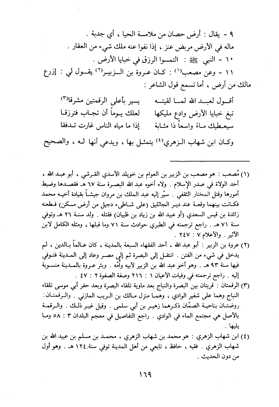 11- وعن مصعب «1» : كان عروة بن الزبير «2» يقول لي: إزرع مالك من أرض، أما تسمع قول الشاعر: