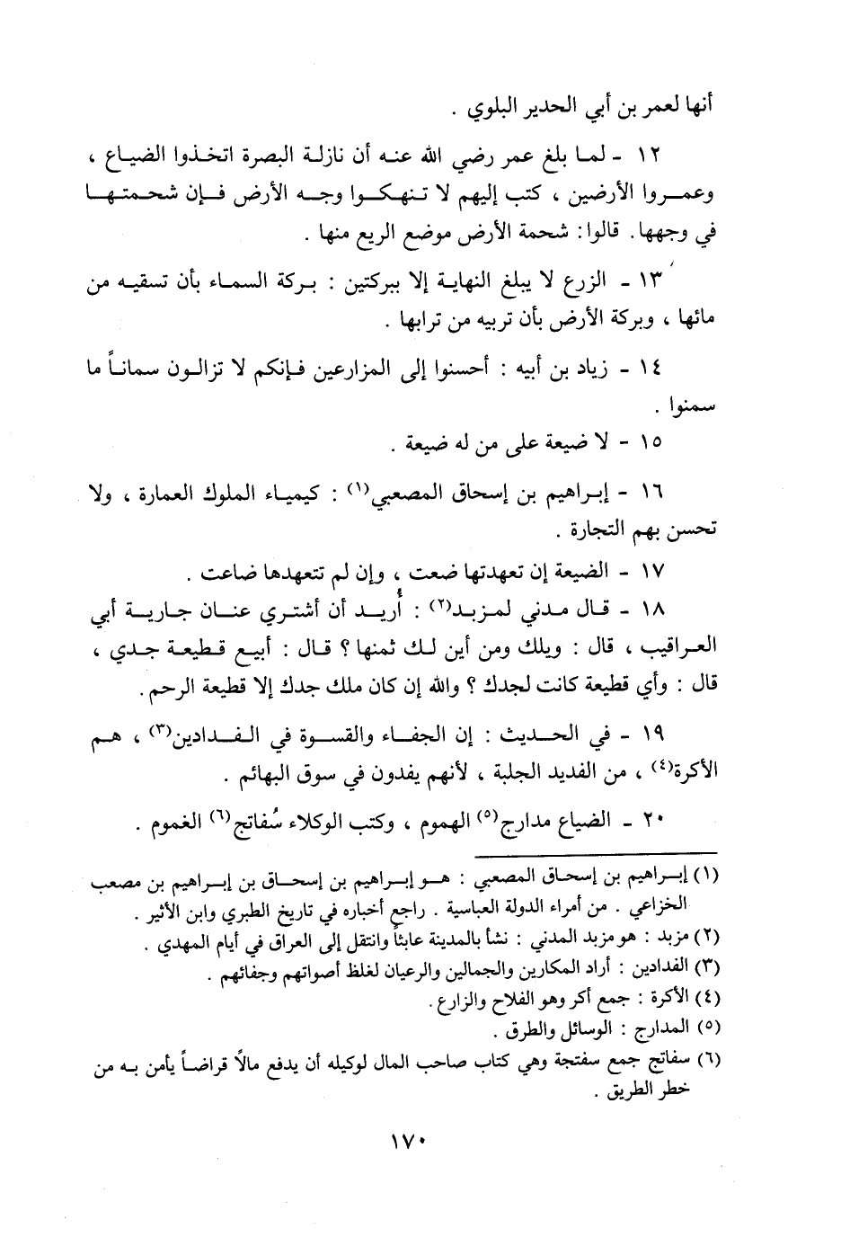 12- لما بلغ عمر رضي الله عنه أن نازلة البصرة اتخذوا الضياع، وعمروا الأرضين، كتب إليهم لا تنهكوا وجه الأرض فإن شحمتها في وجهها. قالوا: شحمة الأرض موضع الريع منها.