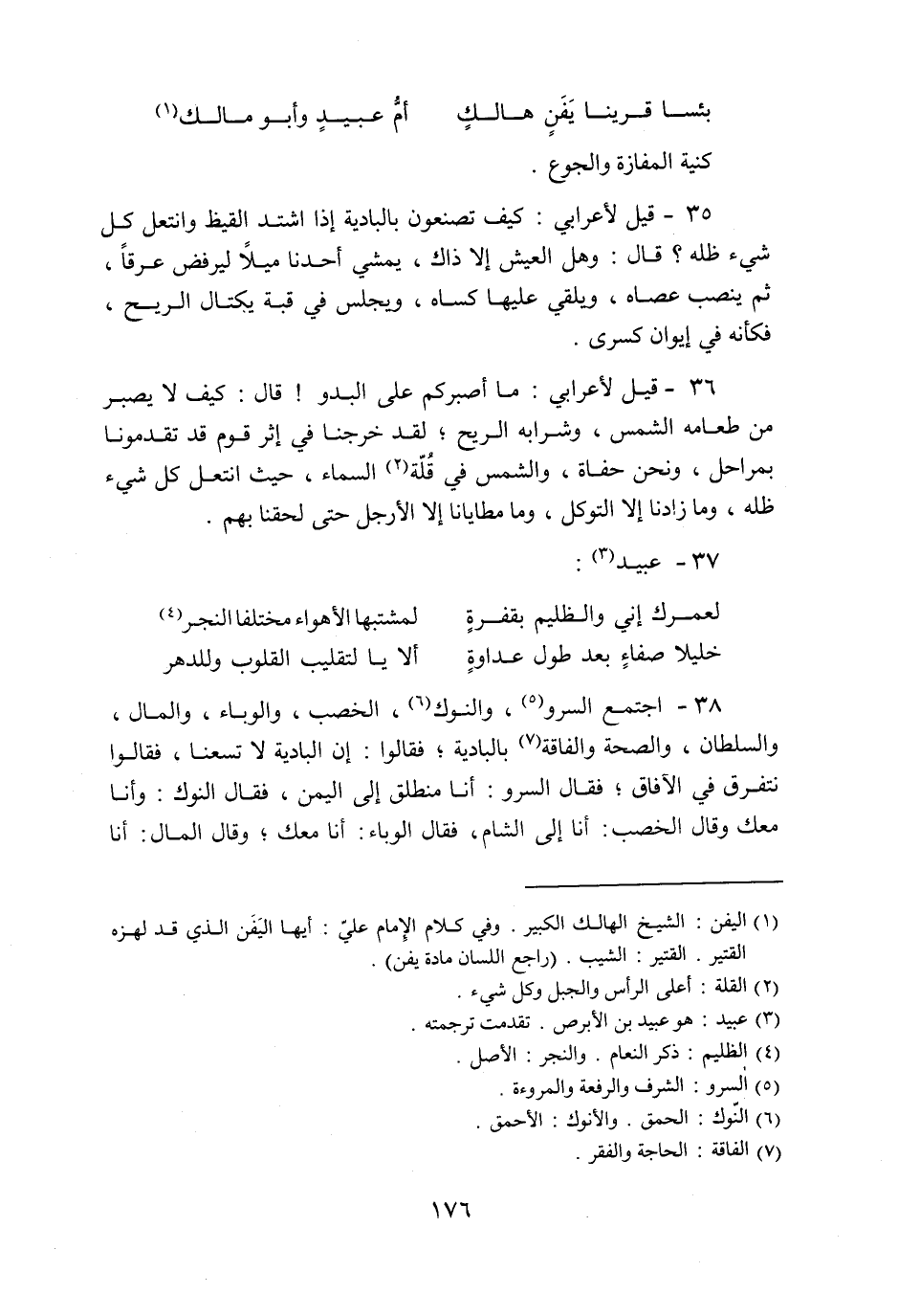 36- قيل لأعرابي: ما أصبركم على البدو! قال: كيف لا يصبر من طعامه الشمس، وشرابه الريح؛ لقد خرجنا في إثر قوم قد تقدمونا بمراحل، ونحن حفاة، والشمس في قلّة «2» السماء، حيث انتعل كل شيء ظله، وما زادنا إلا التوكل، وما مطايانا إلا الأرجل حتى لحقنا بهم.