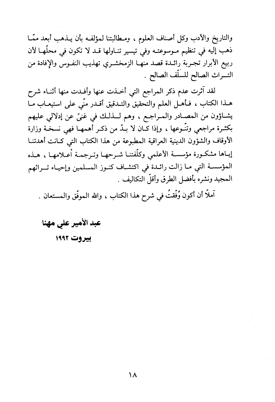 لقد آثرت عدم ذكر المراجع التي أخذت عنها وأفدت منها أثناء شرح هذا الكتاب، فأهل العلم والتحقيق والتدقيق أقدر منّي على استيعاب ما يشاؤون من المصادر والمراجع، وهم لذلك في غنى عن إدلالي عليهم بكثرة مراجعي وتنّوعها، وإذا كان لا بدّ من ذكر أهمها فهي نسخة وزارة الأوقاف والشؤون الدينية العراقية المطبوعة من هذا الكتاب التي كانت أهدتنا إياها مشكورة مؤسسة الأعلمي وكلّفتنا شرحها وترجمة أعلامها، هذه المؤسسة التي ما زالت رائدة في اكتشاف كنوز المسلمين وإحياء تراثهم المجيد ونشره بأفضل الطرق وأقلّ التكاليف.