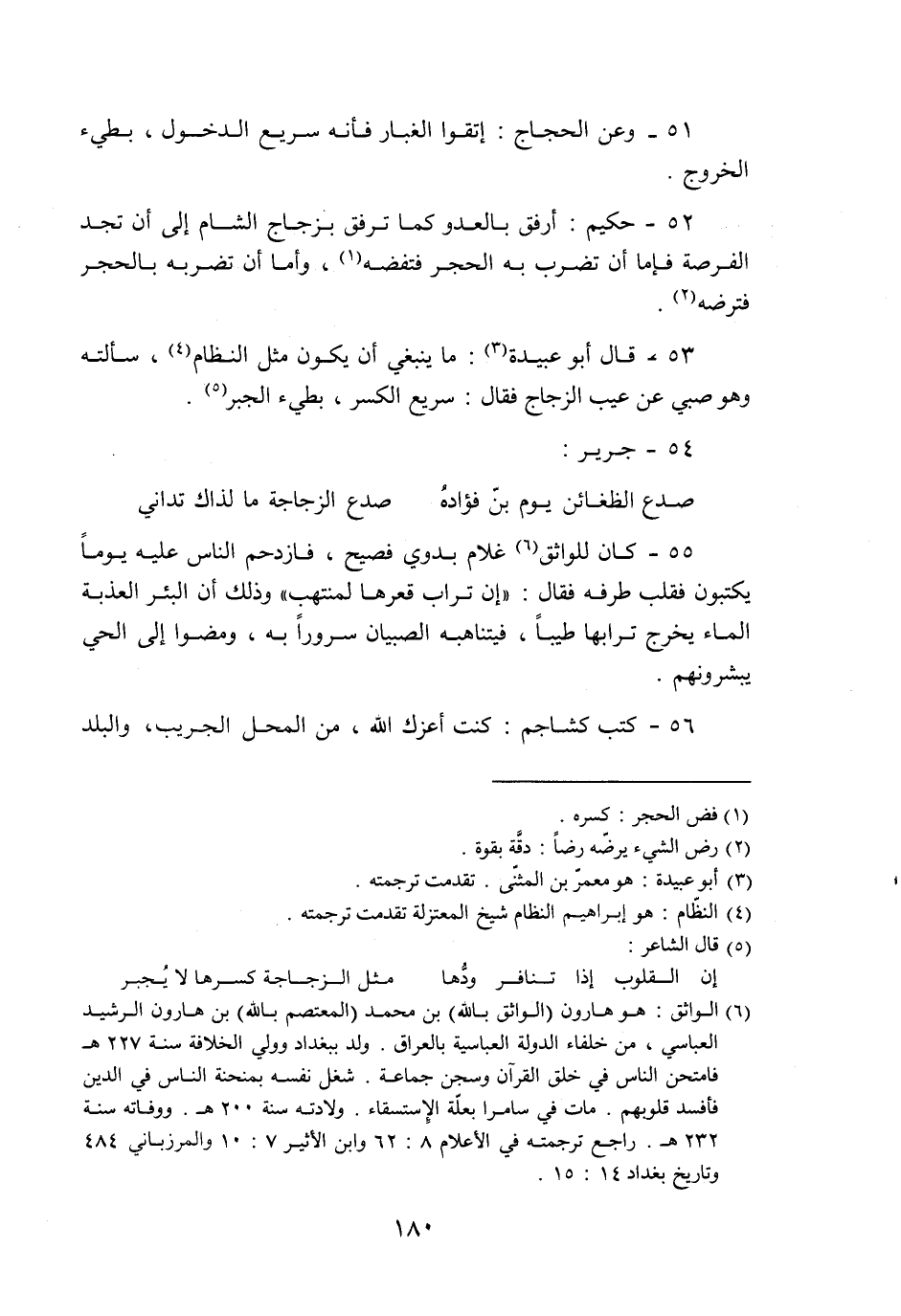 53- قال أبو عبيدة «3» : ما ينبغي أن يكون مثل النظام «4» ، سألته وهو صبي عن عيب الزجاج فقال: سريع الكسر، بطيء الجبر «5» .