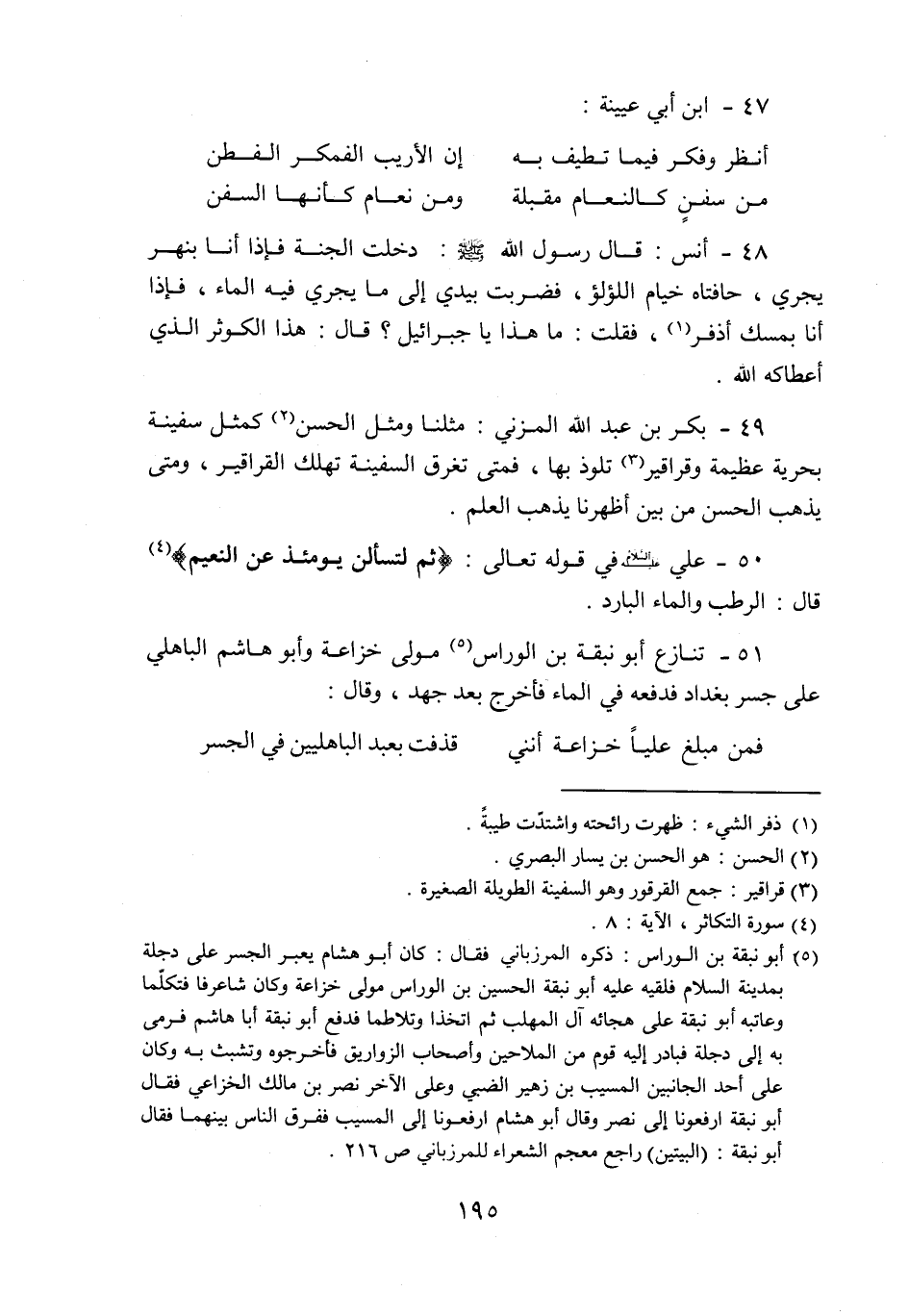 51- تنازع أبو نبقة بن الوراس «5» مولى خزاعة وأبو هاشم الباهلي على جسر بغداد فدفعه في الماء فأخرج بعد جهد، وقال: