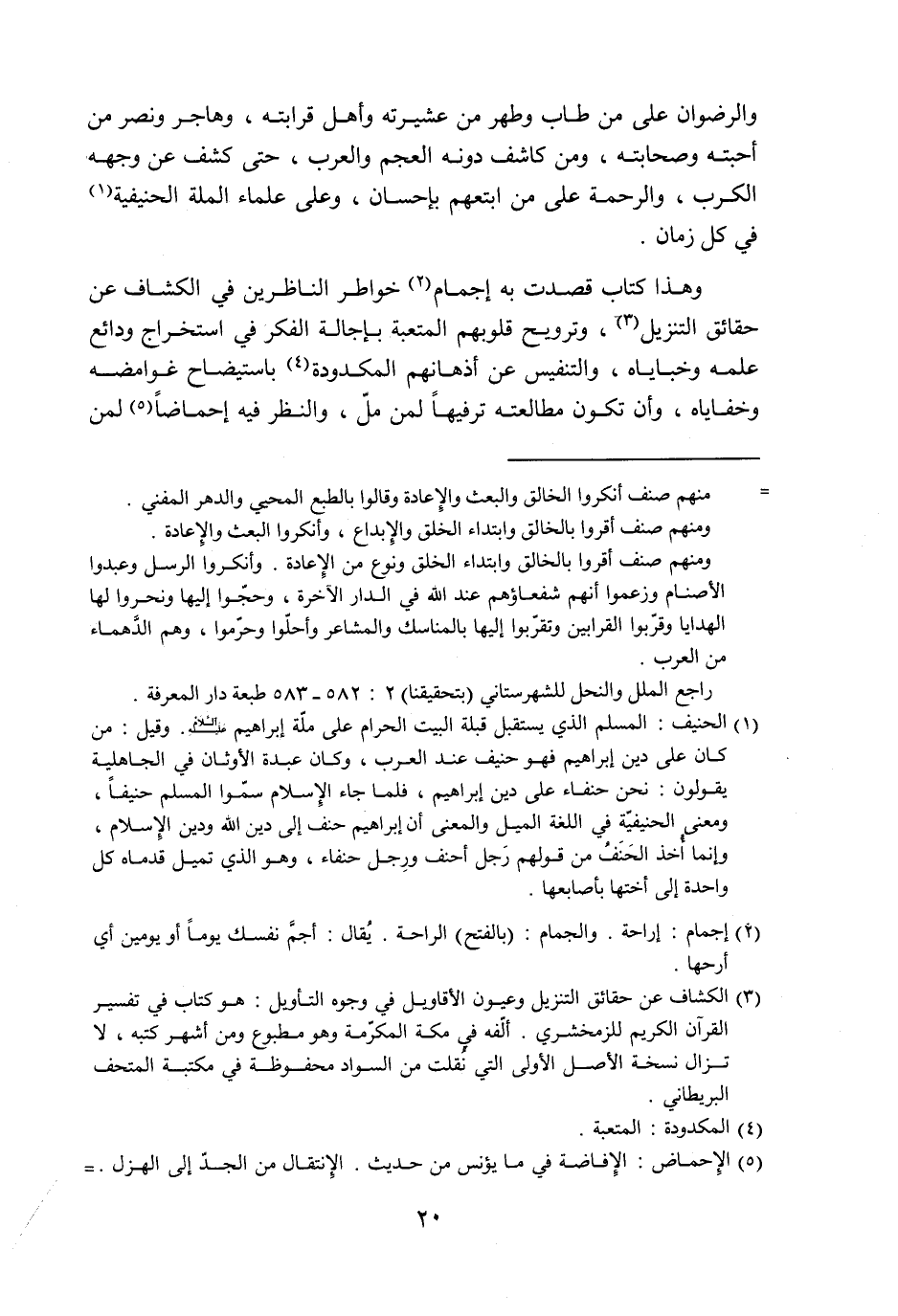 وهذا كتاب قصدت به إجمام «2» خواطر الناظرين في الكشاف عن حقائق التنزيل «3» ، وترويح قلوبهم المتعبة بإجالة الفكر في استخراج ودائع علمه وخباياه، والتنفيس عن أذهانهم المكدودة «4» باستيضاح غوامضه وخفاياه، وأن تكون مطالعته ترفيها لمن ملّ، والنظر فيه إحماضا «5» لمن راجع الملل والنحل للشهرستاني (بتحقيقنا) 2: 582- 583 طبعة دار المعرفة.