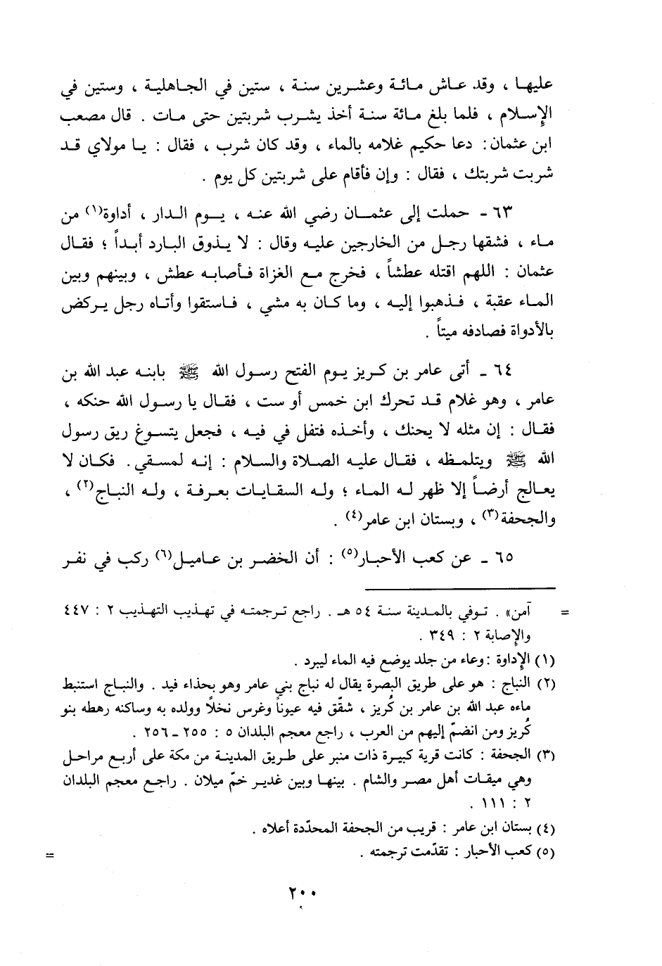 64- أتى عامر بن كريز يوم الفتح رسول الله صلّى الله عليه وسلّم بابنه عبد الله بن عامر، وهو غلام قد تحرك ابن خمس أوست، فقال يا رسول الله حنكه، فقال: إن مثله لا يحنك، وأخذه فتفل في فيه، فجعل يتسوغ ريق رسول الله صلّى الله عليه وسلّم ويتلمظه، فقال عليه الصلاة والسلام: إنه لمسقي. فكان لا يعالج أرضا إلا ظهر له الماء؛ وله السقايات بعرفة، وله النباج «2» ، والجحفة «3» ، وبستان ابن عامر «4» .