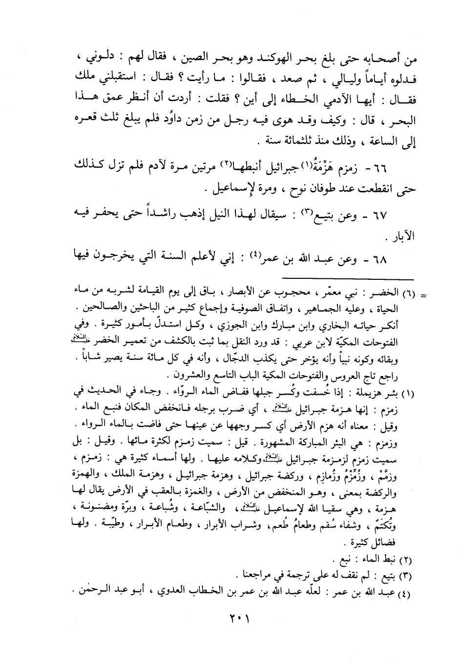 66- زمزم هزمة «1» جبرائيل أنبطها «2» مرتين مرة لآدم فلم تزل كذلك حتى انقطعت عند طوفان نوح، ومرة لإسماعيل.