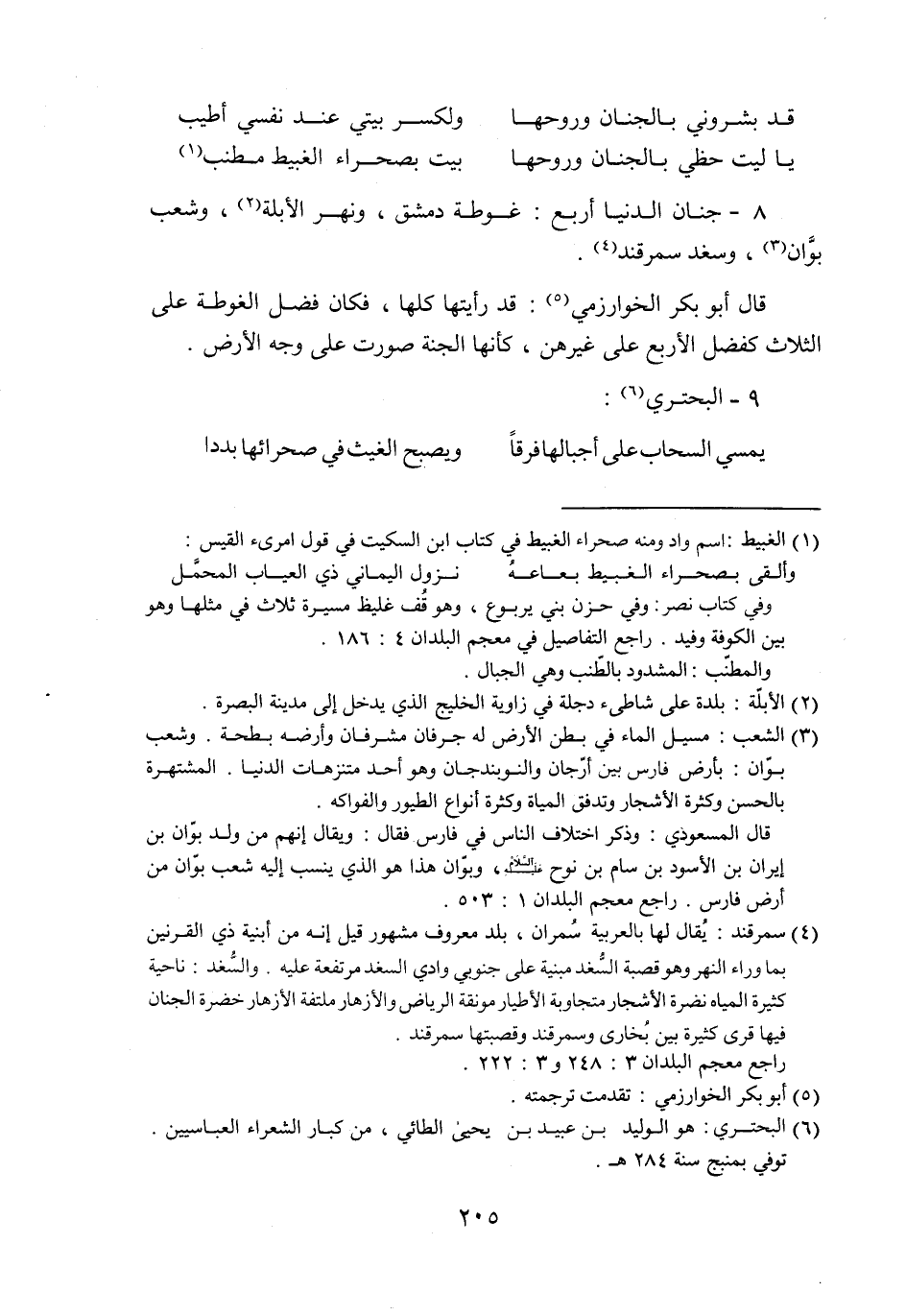 8- جنان الدنيا أربع: غوطة دمشق، ونهر الأبلة «2» ، وشعب بوّان «3» ، وسغد سمرقند «4» .