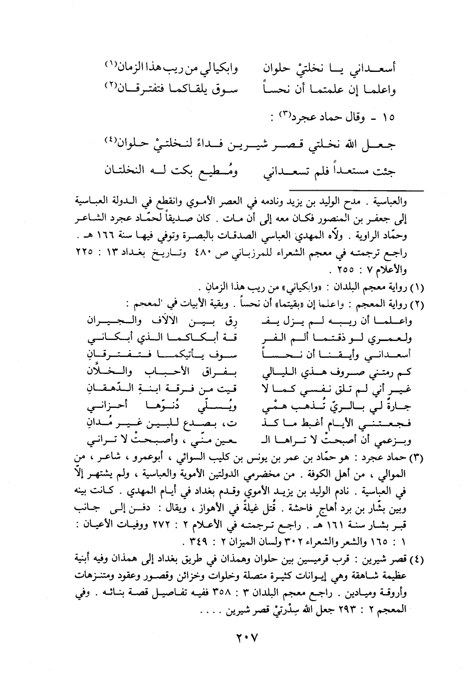 أسعداني يا نخلتي حلوان ... وابكيالي من ريب هذا الزمان «1»