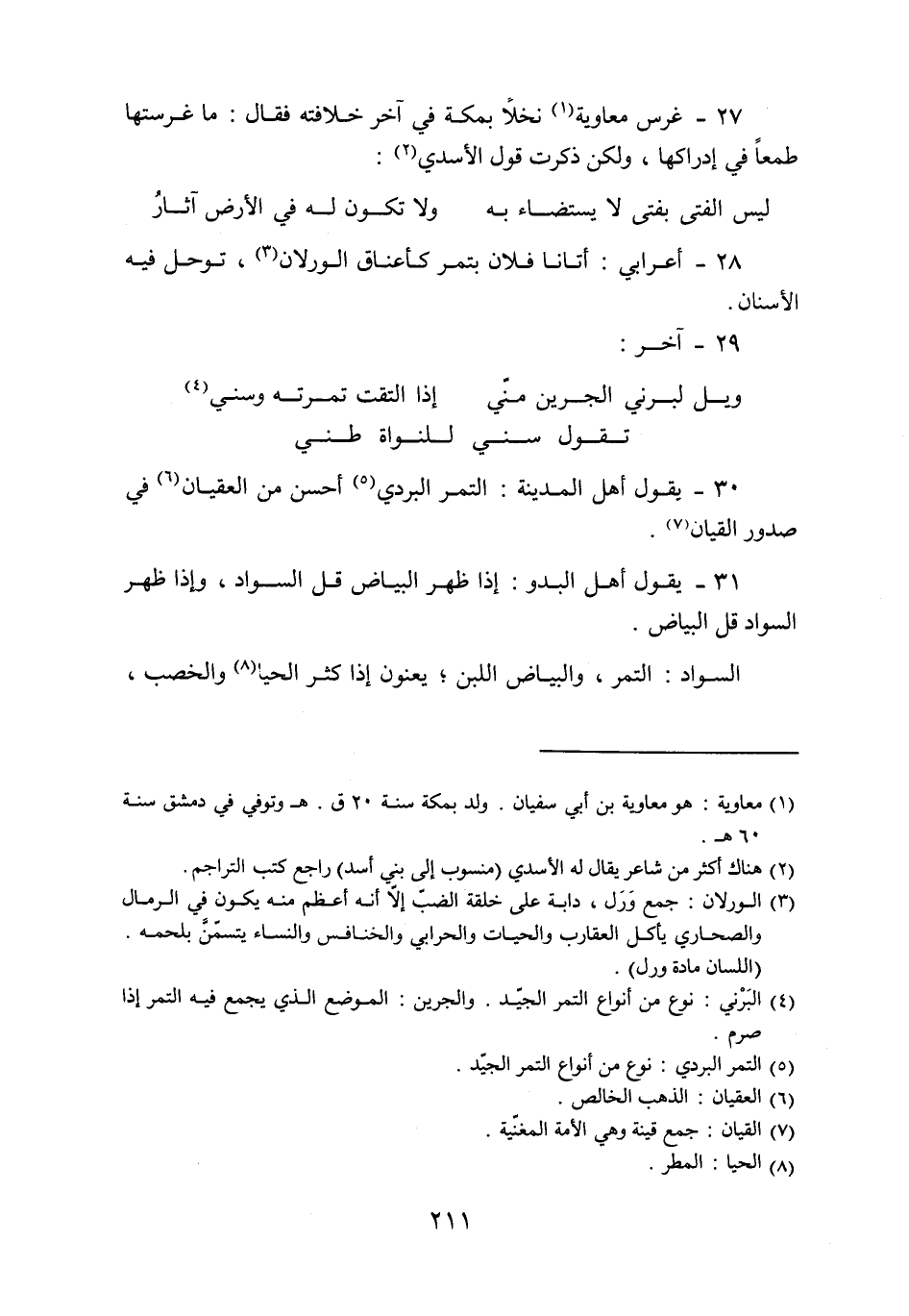 27- غرس معاوية «1» نخلا بمكة في آخر خلافته فقال: ما غرستها طمعا في إدراكها، ولكن ذكرت قول الأسدي «2» :