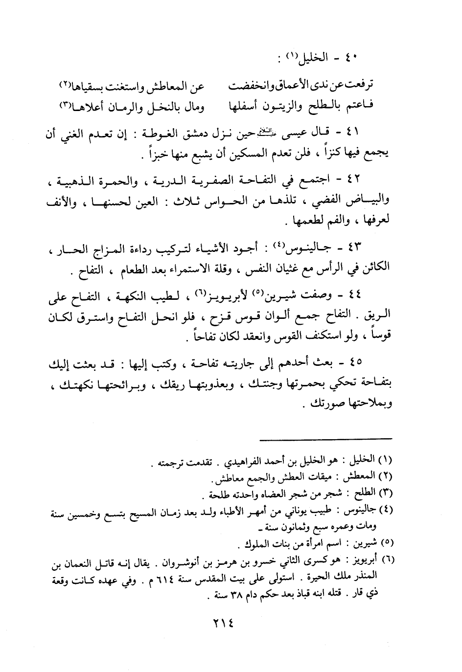 44- وصفت شيرين «5» لأبريويز «6» ، لطيب النكهة، التفاح على الريق. التفاح جمع ألوان قوس قزح، فلو انحل التفاح واسترق لكان قوسا، ولو استكنف القوس وانعقد لكان تفاحا.
