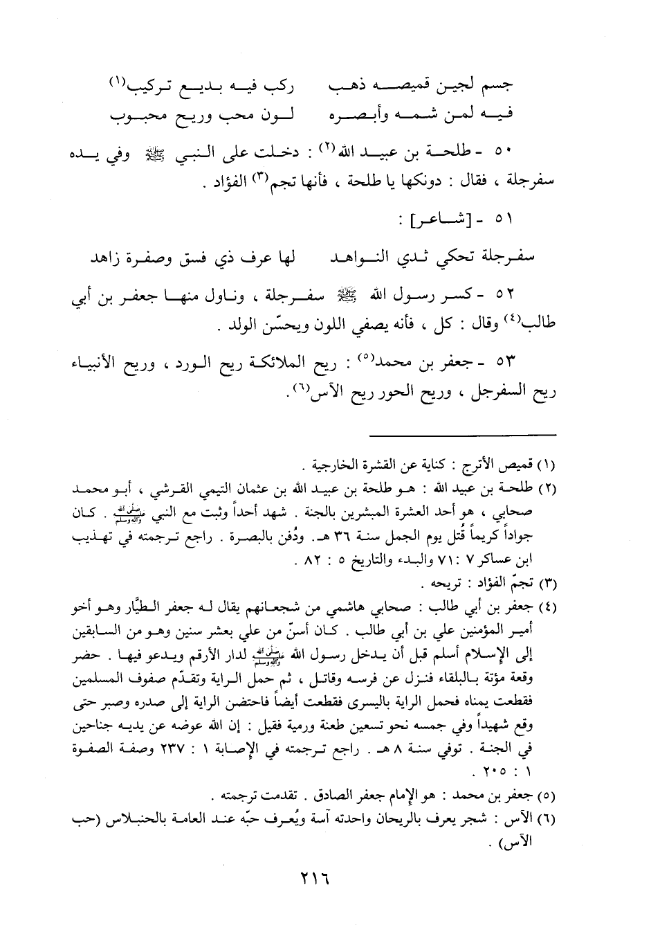 50- طلحة بن عبيد الله «2» : دخلت على النبي صلّى الله عليه وسلّم وفي يده سفرجلة، فقال: دونكها يا طلحة، فأنها تجم «3» الفؤاد.