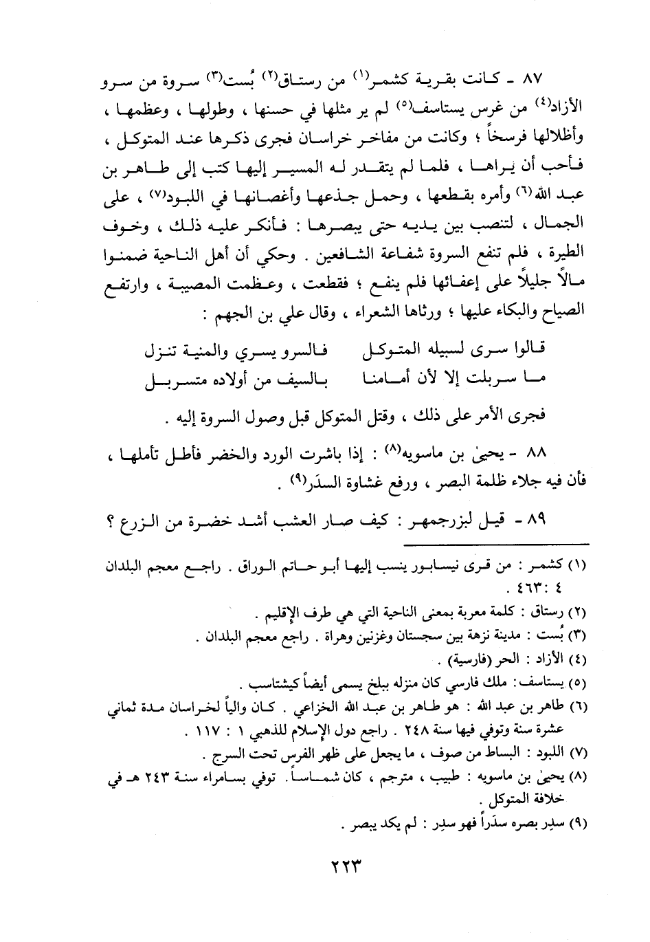 87- كانت بقرية كشمر «1» من رستاق «2» بست «3» سروة من سرو الأزاد «4» من غرس يستاسف «5» لم ير مثلها في حسنها، وطولها، وعظمها، وأظلالها فرسخا؛ وكانت من مفاخر خراسان فجرى ذكرها عند المتوكل، فأحب أن يراها، فلما لم يتقدر له المسير إليها كتب إلى طاهر بن عبد الله «6» وأمره بقطعها، وحمل جذعها وأغصانها في اللبود «7» ، على الجمال، لتنصب بين يديه حتى يبصرها: فأنكر عليه ذلك، وخوف الطيرة، فلم تنفع السروة شفاعة الشافعين. وحكي أن أهل الناحية ضمنوا مالا جليلا على إعفائها فلم ينفع؛ فقطعت، وعظمت المصيبة، وارتفع الصياح والبكاء عليها؛ ورثاها الشعراء، وقال علي بن الجهم: