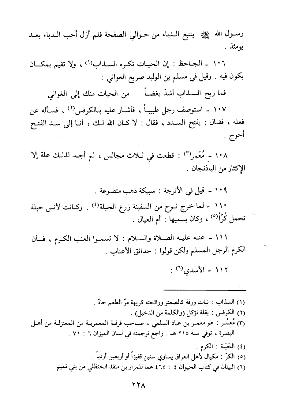 106- الجاحظ: إن الحيات تكره السذاب «1» ، ولا تقيم بمكان يكون فيه. وقيل في مسلم بن الوليد صريع الغواني: