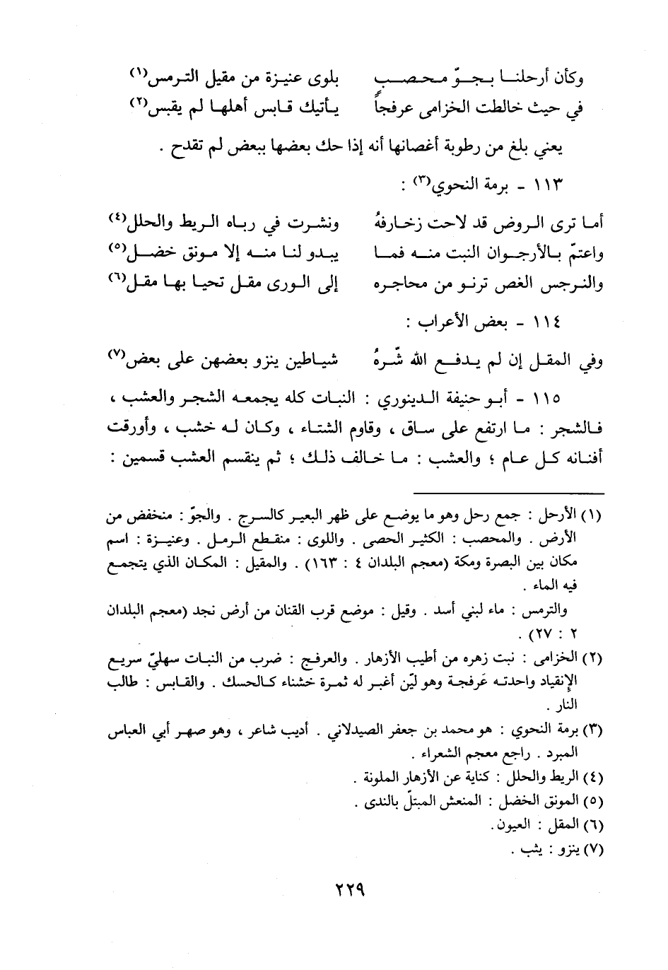 115- أبو حنيفة الدينوري: النبات كله يجمعه الشجر والعشب، فالشجر: ما ارتفع على ساق، وقاوم الشتاء، وكان له خشب، وأورقت أفنانه كل عام؛ والعشب: ما خالف ذلك؛ ثم ينقسم العشب قسمين: