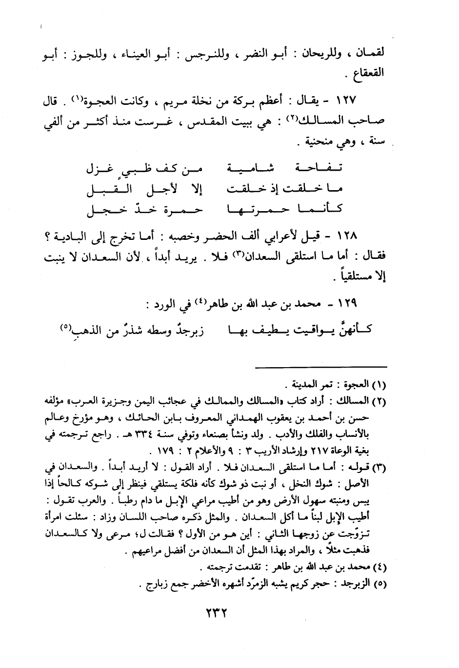 127- يقال: أعظم بركة من نخلة مريم، وكانت العجوة «1» . قال صاحب المسالك «2» : هي ببيت المقدس، غرست منذ أكثر من ألفي سنة، وهي منحنية.