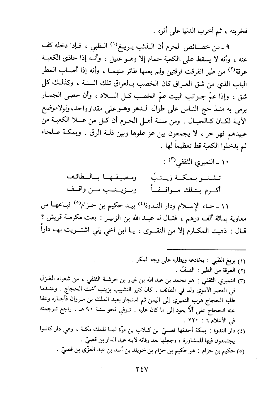 9- من خصائص الحرم أن الذئب يريغ «1» الظبي، فإذا دخله كف عنه، وأنه لا يسقط على الكعبة حمام إلا وهو عليل، وأنه إذا حاذى الكعبة عرقة «2» من طير انفرقت فرقتين ولم يعلها طائر منهما، وأنه إذا أصاب المطر الباب الذي من شق العراق كان الخصب بالعراق تلك السنة، وكذلك كل شق، وإذا عمّ جوانب البيت عمّ الخصب كل البلاد، وأن حصى الجمار يرمى به منذ حج الناس على طوال الدهر وهو على مقدار واحد، ولولا موضع الآية لكان كالجبال. ومن سنة أهل الحرم أن كل من علا الكعبة من عبيدهم فهر حر، لا يجمعون بين عز علوها وبين ذلة الرق. وبمكة صلحاء لم يدخلوا الكعبة قط تعظيما لها.