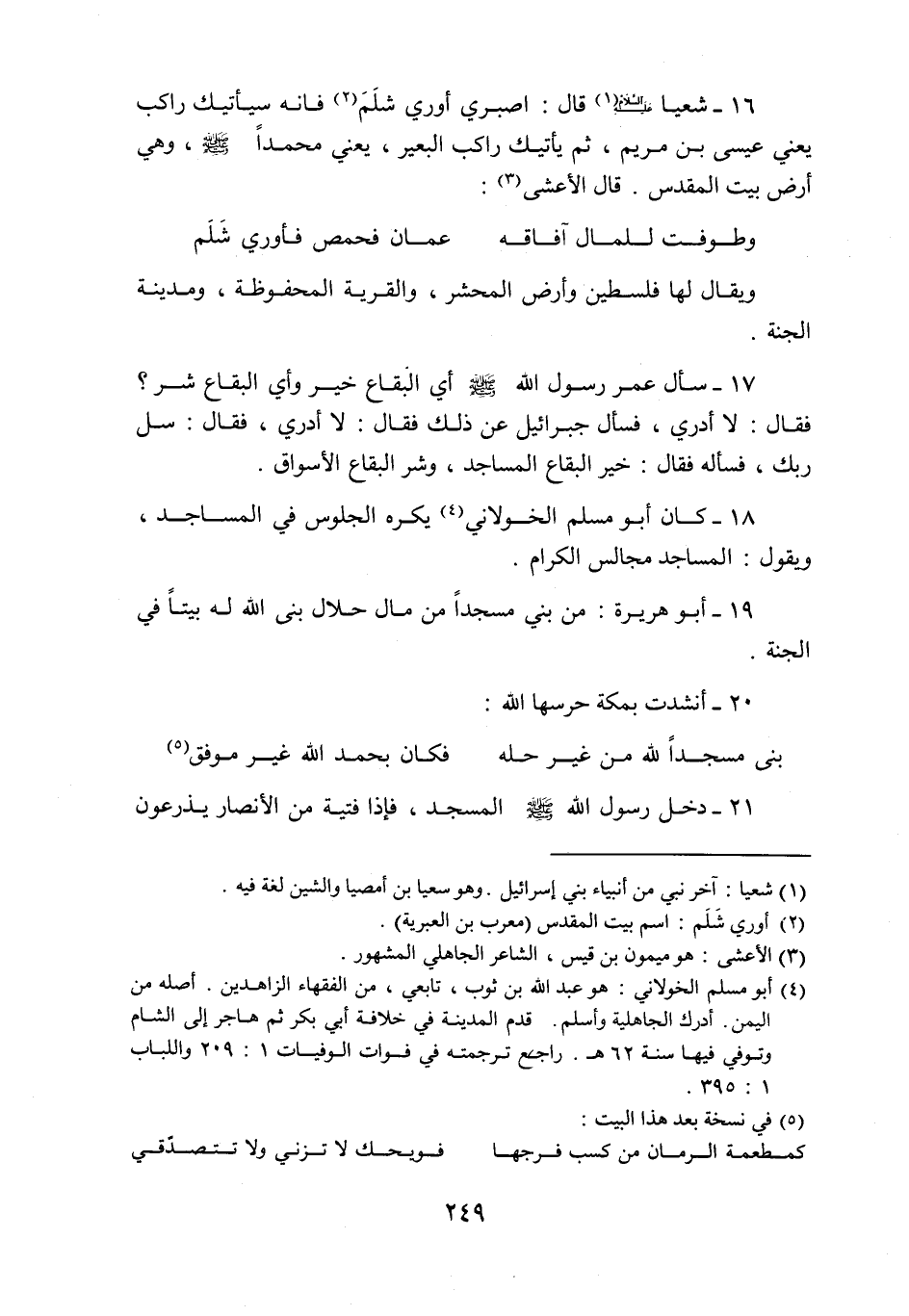 16- شعيا عليه السّلام «1» قال: اصبري أوري شلم «2» فانه سيأتيك راكب يعني عيسى بن مريم، ثم يأتيك راكب البعير، يعني محمدا صلّى الله عليه وسلّم، وهي أرض بيت المقدس. قال الأعشى «3» :