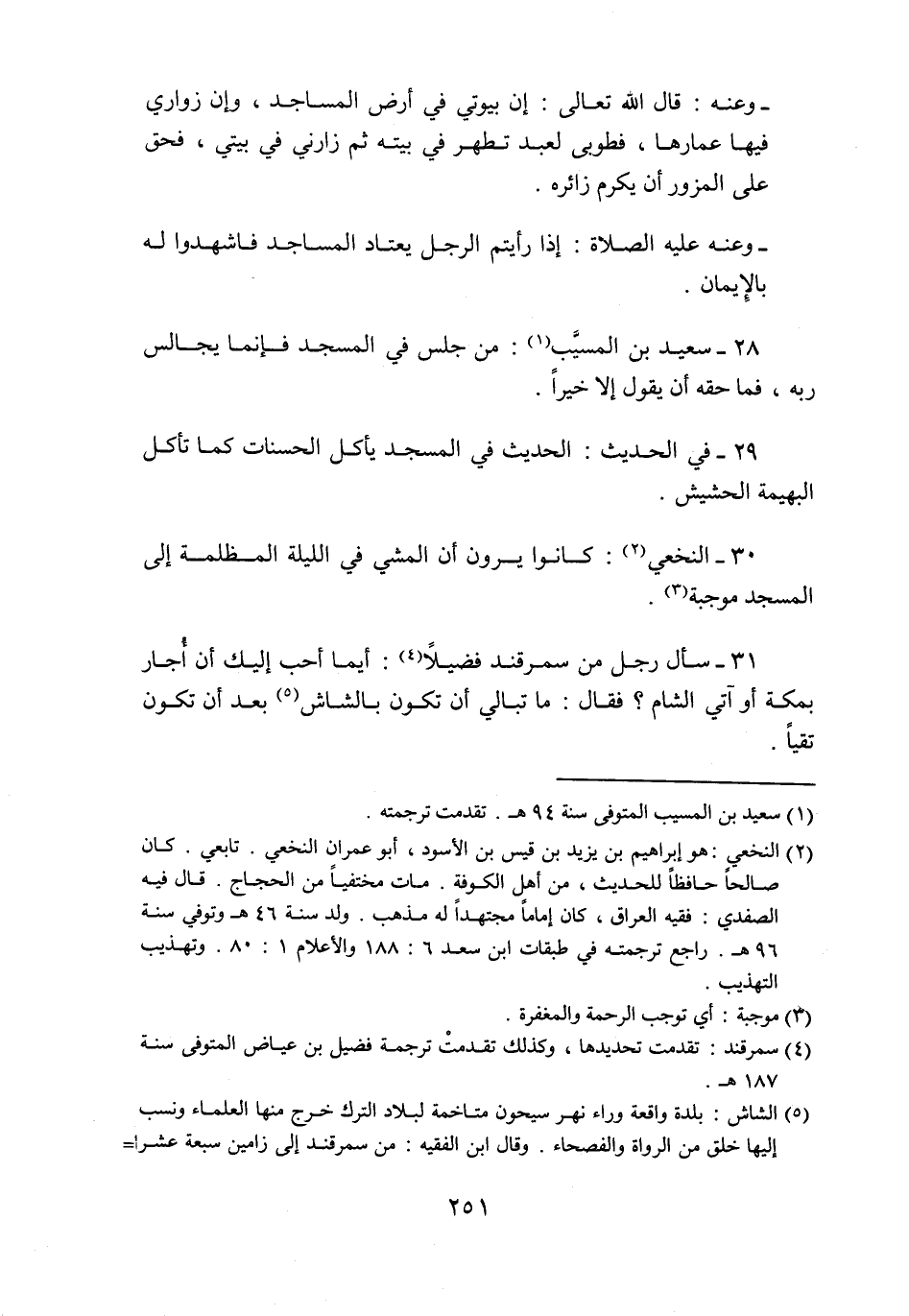 30- النخعي «2» : كانوا يرون أن المشي في الليلة المظلمة إلى المسجد موجبة «3» .