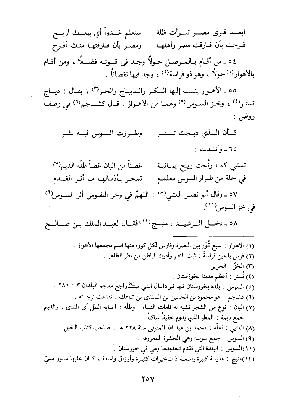 55- الأهواز ينسب إليها السكر والديباج والخر «3» ، يقال: ديباج تستر «4» ، وخز السوس «5» وهما من الأهواز. قال كشاجم «6» في وصف روض: