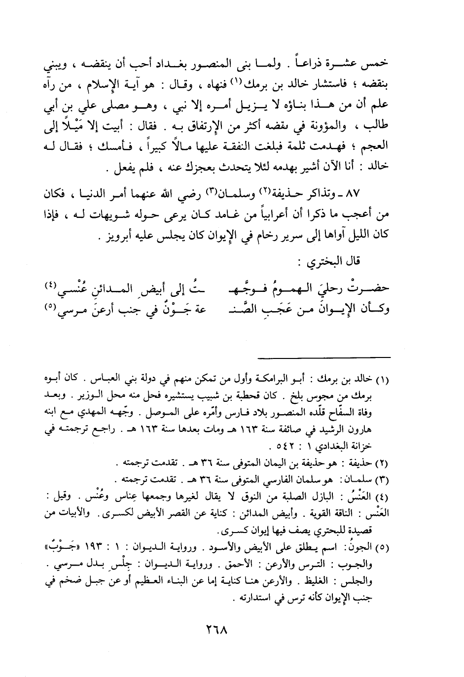 87- وتذاكر حذيفة «2» وسلمان «3» رضي الله عنهما أمر الدنيا، فكان من أعجب ما ذكرا أن أعرابيا من غامد كان يرعى حوله شويهات له، فإذا كان الليل آواها إلى سرير رخام في الإيوان كان يجلس عليه أبرويز.