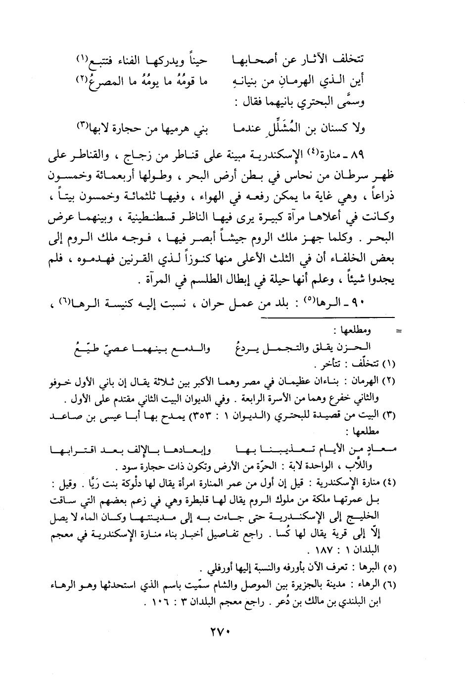 89- منارة «4» الإسكندرية مبينة على قناطر من زجاج، والقناطر على ظهر سرطان من نحاس في بطن أرض البحر، وطولها أربعمائة وخمسون ذراعا، وهي غاية ما يمكن رفعه في الهواء، وفيها ثلاثمائة وخمسون بيتا، وكانت في أعلاها مرآة كبيرة يرى فيها الناظر قسطنطينية، وبينهما عرض البحر. وكلما جهز ملك الروم جيشا أبصر فيها، فوجه ملك الروم إلى بعض الخلفاء أن في الثلث الأعلى منها كنوزا لذي القرنين فهدموه، فلم يجدوا شيئا، وعلم أنها حيلة في إبطال الطلسم في المرآة.