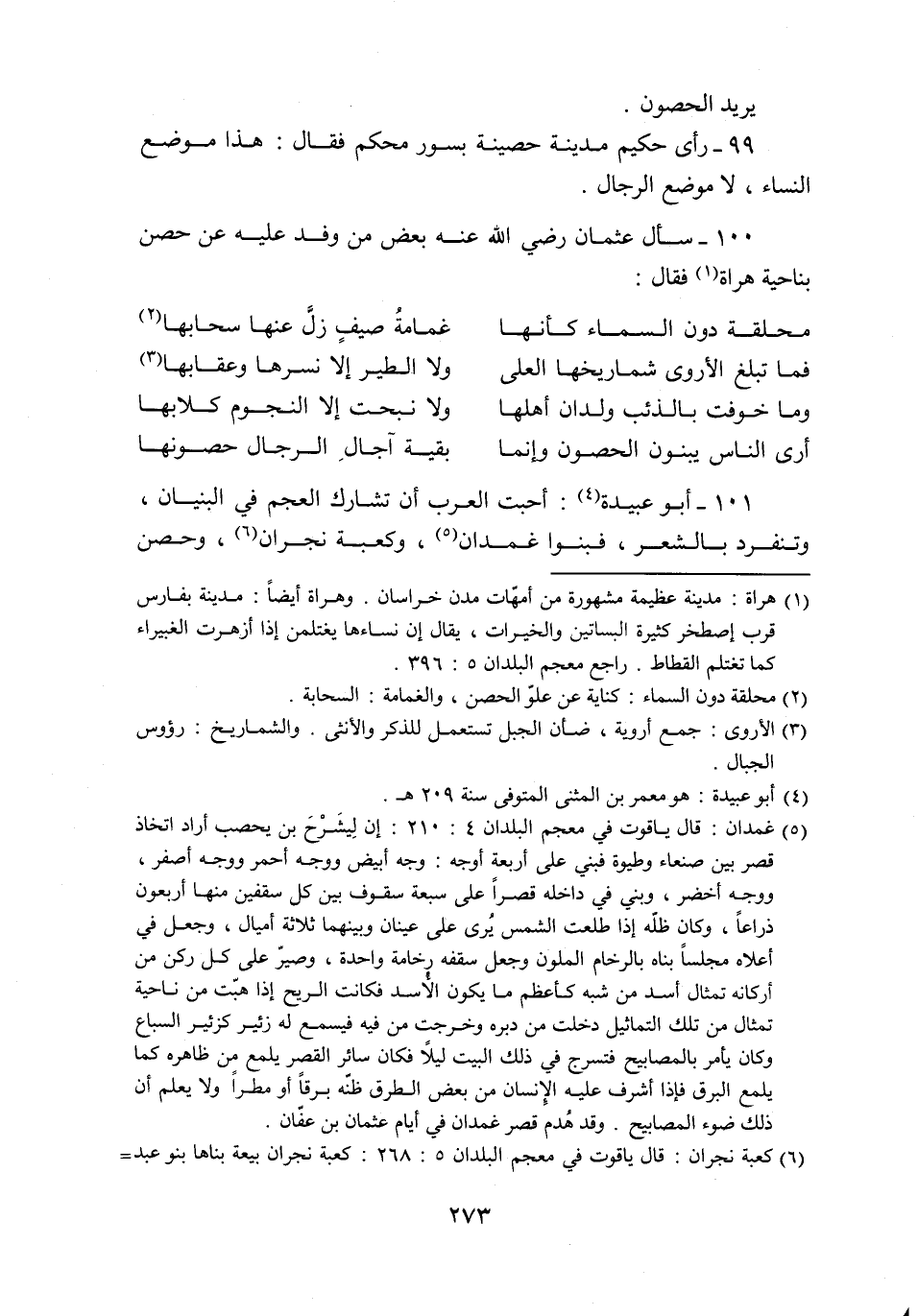 100- سأل عثمان رضي الله عنه بعض من وفد عليه عن حصن بناحية هراة «1» فقال: